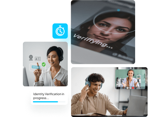 Our Video KYC platform enables remote identity verification through live video interviews, eliminating the need for physical presence. The verification process occurs seamlessly through online video calls, where customers interact with verification agents. This ensures a secure and monitored environment for identity verification.